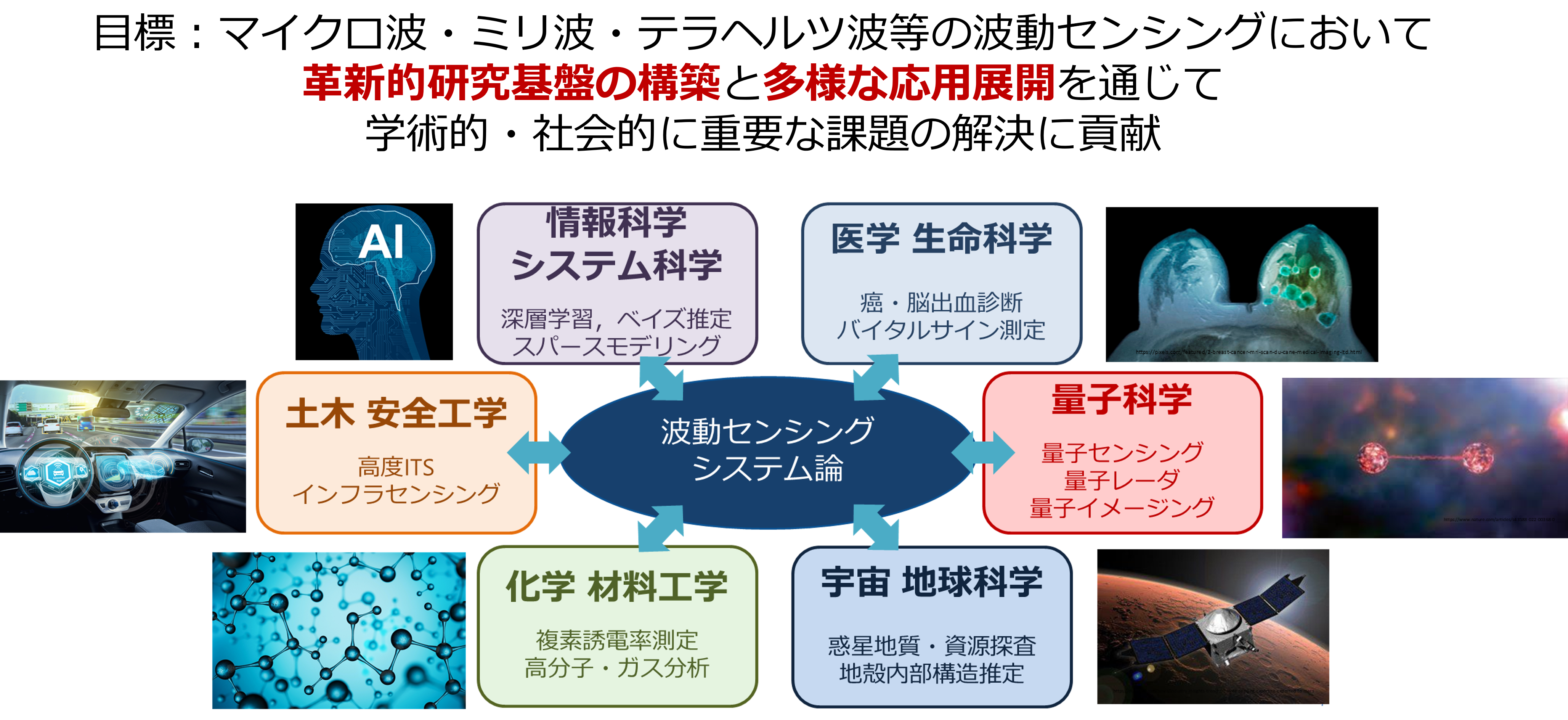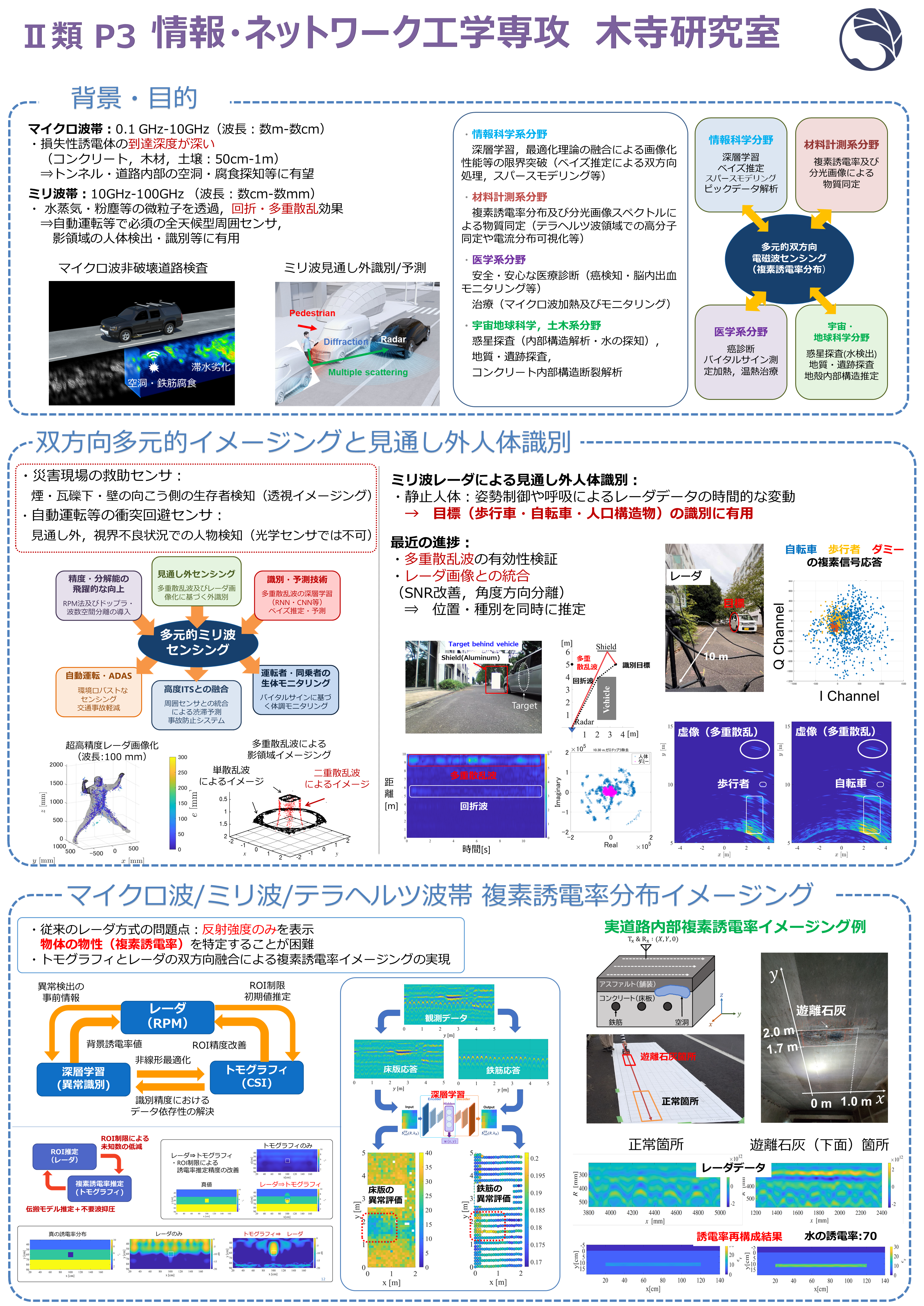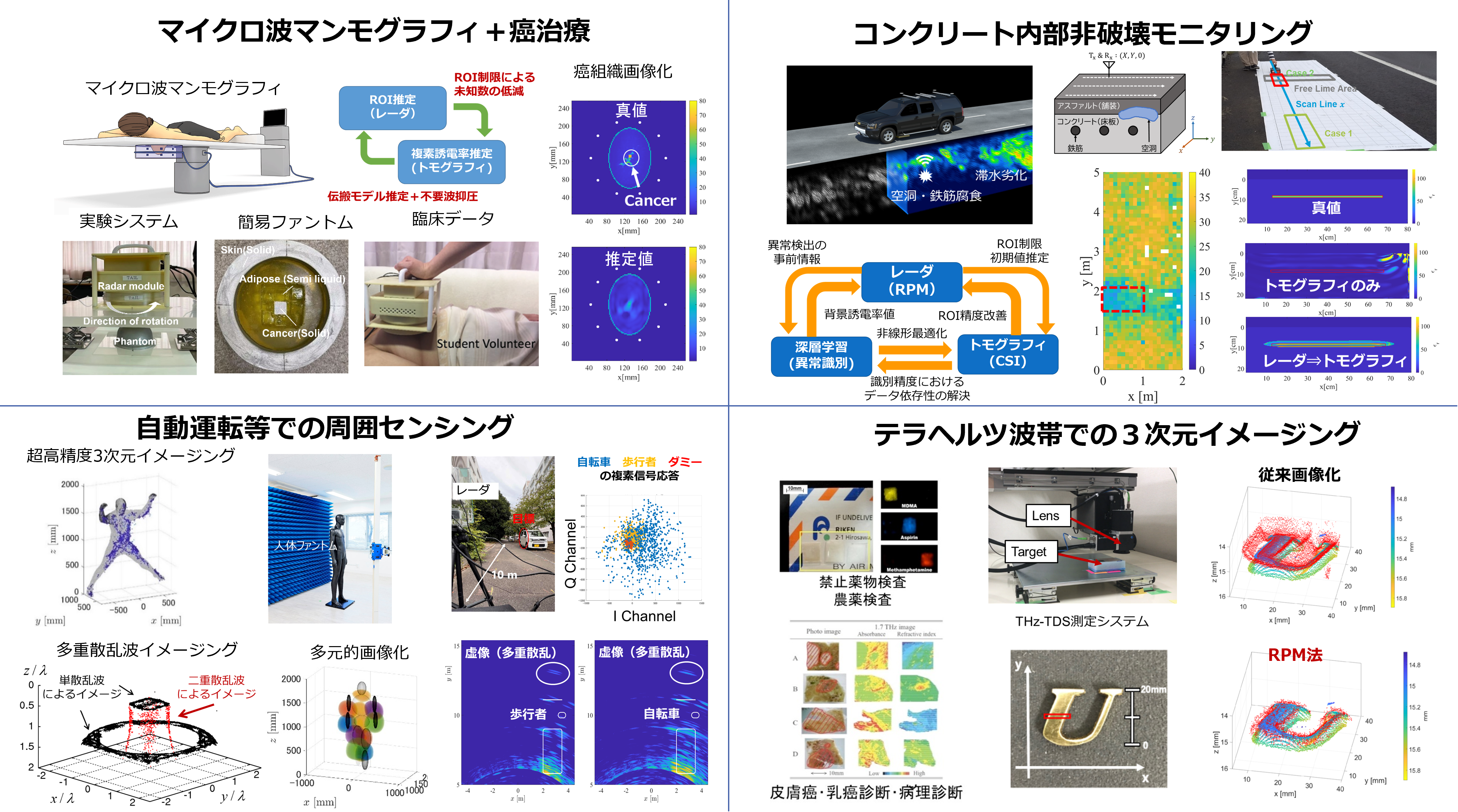 光学センサ(レーザ・カメラ等)では見ることができない状況下でのセンシングが可能です。このため、以下の各種の社会的・産業的需要の高い応用分野に有望であるとされています。
